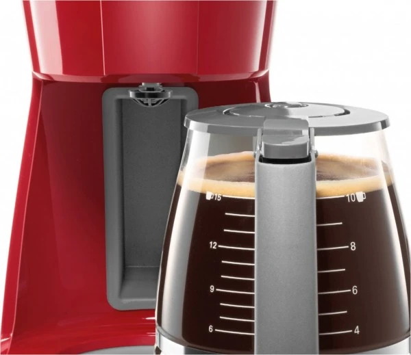 Anschlusswert: 900-1100 Watt, Aromaschutz-Glaskanne für 10/15 Tassen (1.25 l), Tiefbrühverfahren für optimales Kaffeearoma, Tropfstopp, Wassertank integriert mit Wasserstandsanzeige, außen ablesbar, Filterträger schwenk- und abnehmbar (1×4), Warmhalteplatte, automatische Abschaltung nach 2 Stunden, Ein-/Ausschalter beleuchtet, SafeStorage zur leichten und sicheren Aufbewahrung: Kannengriff, Kabel und Stecker verschwinden im Inneren der Kaffeemaschine, Netzkabel 90 cm, Gerätemaße (HxBxT): 33,5 x 17 x 24,5 cm.