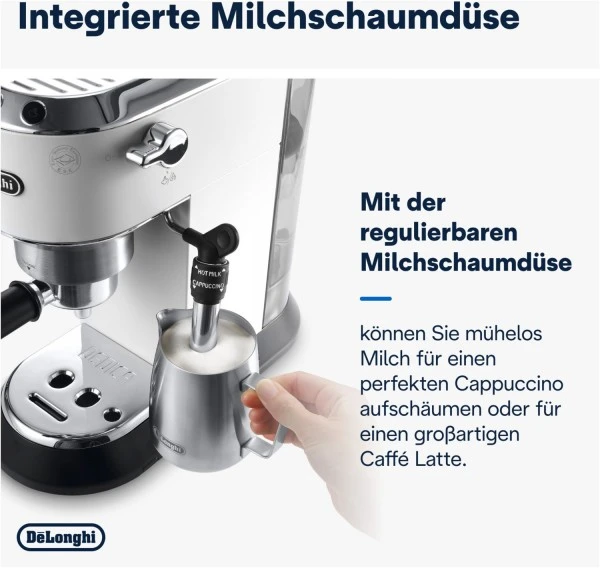 Mit der Kombination aus professioneller Milchaufschäumdüse und höhenverstellbare Tassenabstellfläche können Cappuccino, Latte Macchiato und andere Milch-Kaffeespezialitäten auch zu Hause stilecht in hohen Gläsern zubereitet werden.